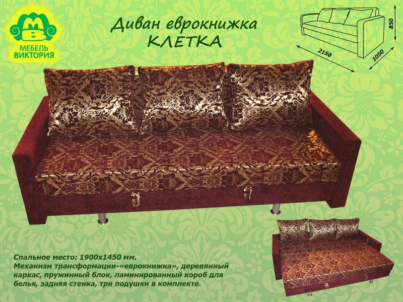 Механизм трансформации "еврокнижка", достоинства: простота раскладывания, вместительный бельевой ящик, не нужно отодвигать от стенки в момент трансформации.