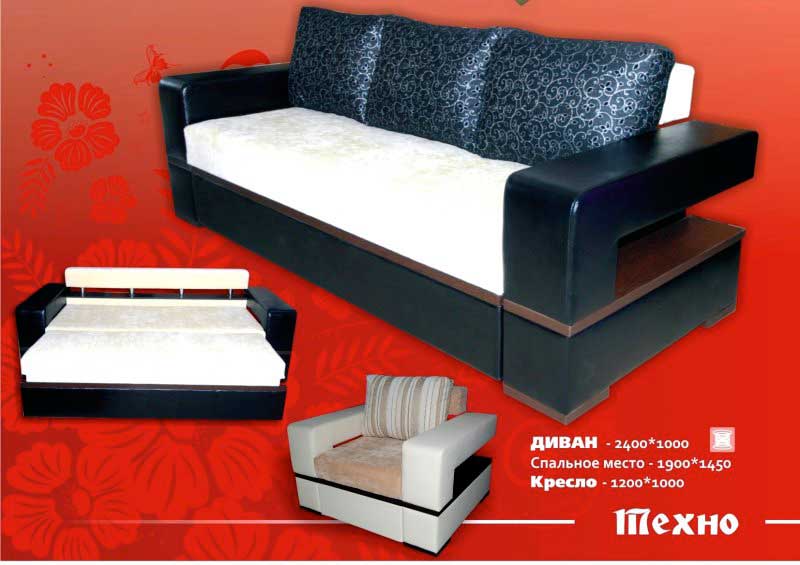 Фабрика диванов: Династия Спальное место: 1900*1450Диван техно имеет в наполнении не только пенополиуретан, но пружинный блог. Способ раскладывания -шагающая спинка. Имеется вместительный ящик для белья.Есть возможность изготовления углового диван- 8840 грн, а так-же кресло- 3313 грн.