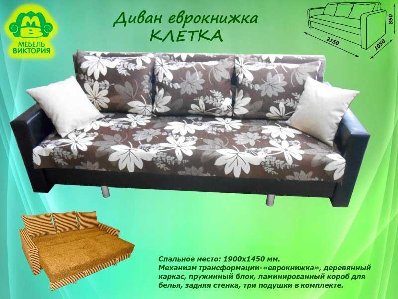 Удобный и компактный диван Клетка.Непременно украсит вашу комнату и позволит отдохнуть после трудового дня. Габаритные размеры: ширина-2150 мм., глубина-1050 мм., высота-800 мм. Спальное место: 1900х1450 мм. Материал каркаса: деревянный брус, ДСП, ДВП. Наполнение: пружинный блок 130 мм. войлок, ППУ, синтепон, деревянный каркас, ламинированный бельевой ящик, задняя стенка, три подушки в комплекте.